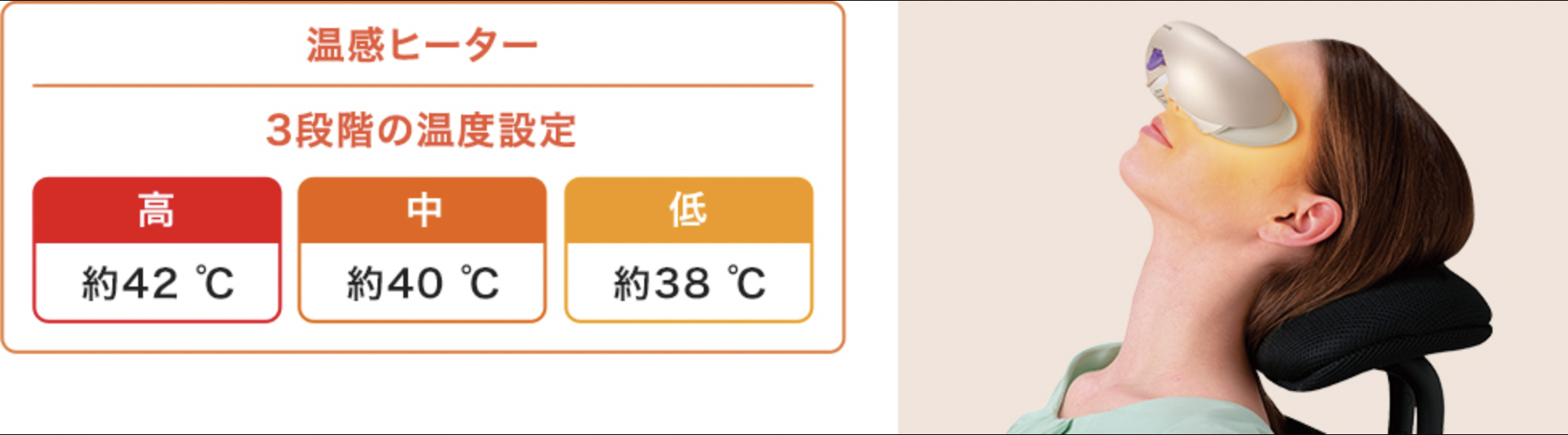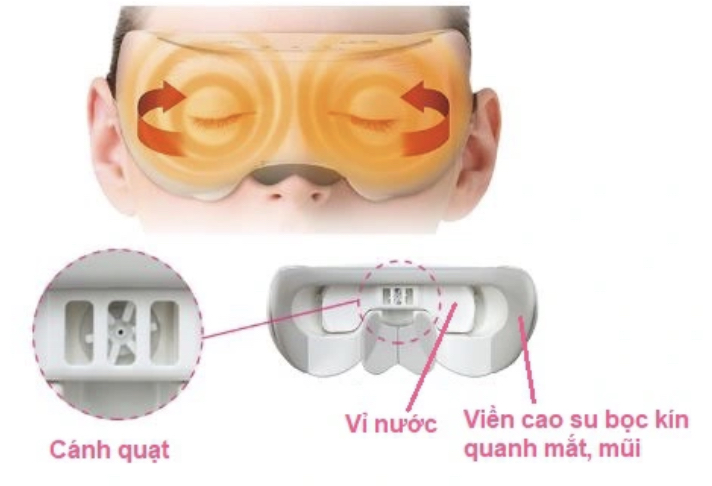 - 2 mức nhiệt 38°C và 42°C kết hợp làm ấm bằng chế độ xông nhiệt vùng mắt, thúc đẩy lưu thông các mạch máu dưới vùng da nhạy cảm này, giảm đáng kể hiện tượng quầng thâm mắt.